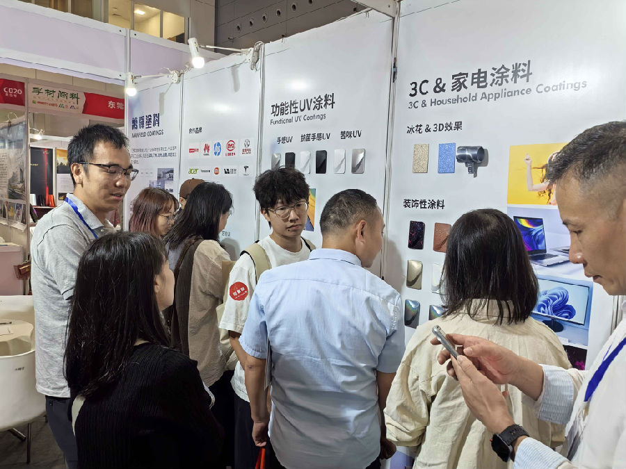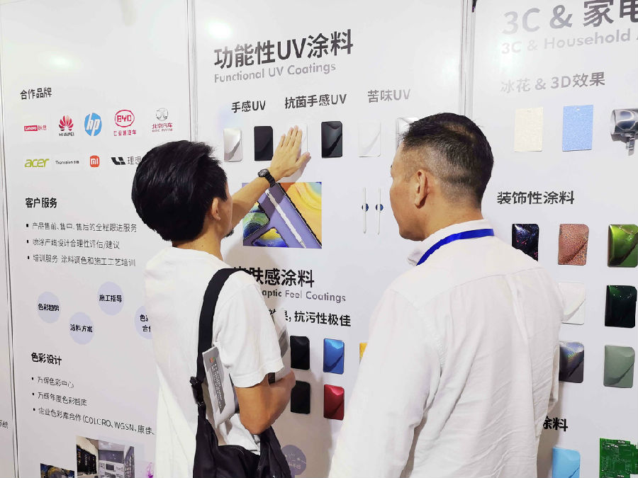 萬輝為頭部企業(yè)定制且已量產(chǎn)化的“功能性UV涂料”,成為了展會(huì)客戶持續(xù)關(guān)注及合作意向。