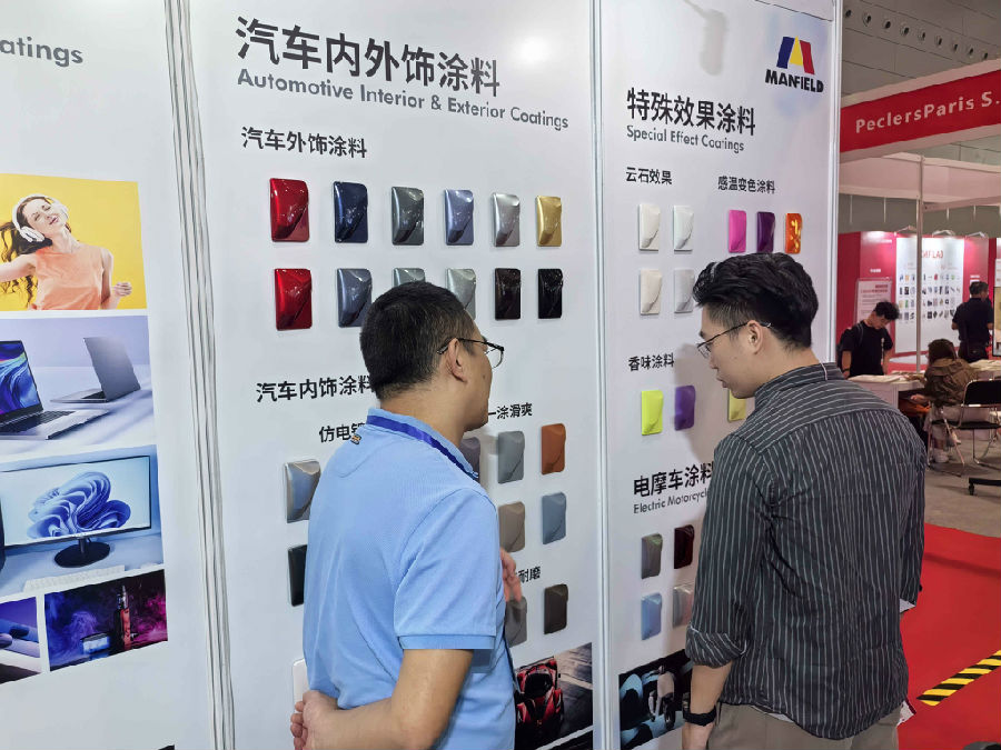 萬輝集團(tuán)以“功能性UV涂料”“汽車內(nèi)外飾涂料”“3C&家電涂料”“電摩車涂料”“特殊效果涂料”5大主題進(jìn)行產(chǎn)品展示。其中,萬輝定制化的功能性UV系列、汽車內(nèi)外飾涂料的應(yīng)用,吸引了展會(huì)客戶的重點(diǎn)關(guān)注及陸續(xù)的打板需求。